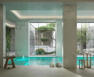 El complejo residencial ofrece una amplia gama de comodidades, que incluyen un gimnasio deportivo moderno, un soleado solárium, una piscina infinita con bar, cómodos espacios de coworking, una sala de juegos de entretenimiento, un cine de primera calidad, un parque infantil bien equipado, un servicio de conserjería las 24 horas y un acogedor spa.