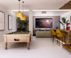 Strategically placed windows in the basement provide ample natural light, and buyers can customize room sizes to suit their needs. Currently, the basement plan includes 2 bedrooms and a large home cinema, but one of the bedrooms can be replaced with a more spacious cinema or game room. The swimming pool harmoniously complements the villa, creating an impression as if the blue reflected light is shimmering through this exquisite property.